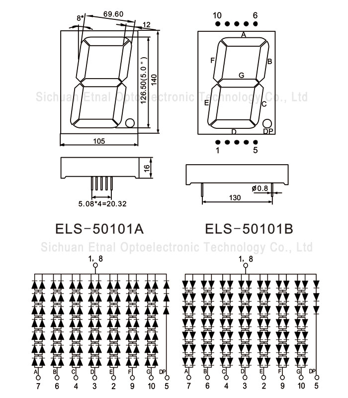 | ELS-50101BS | 5" 英寸 | 1位數(shù)碼管 | 共陽(yáng) | 紅色 | 5-20 | 1.8-2.0 | 620-640 |
